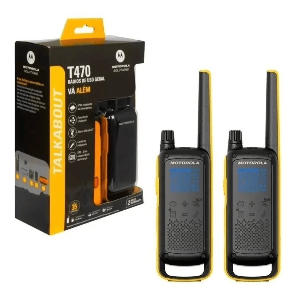 Par de Rádios T470, 2 Presilhas de Cinto, 2 Baterias, Carregador, 16 autocolantes, Guia do Usuário